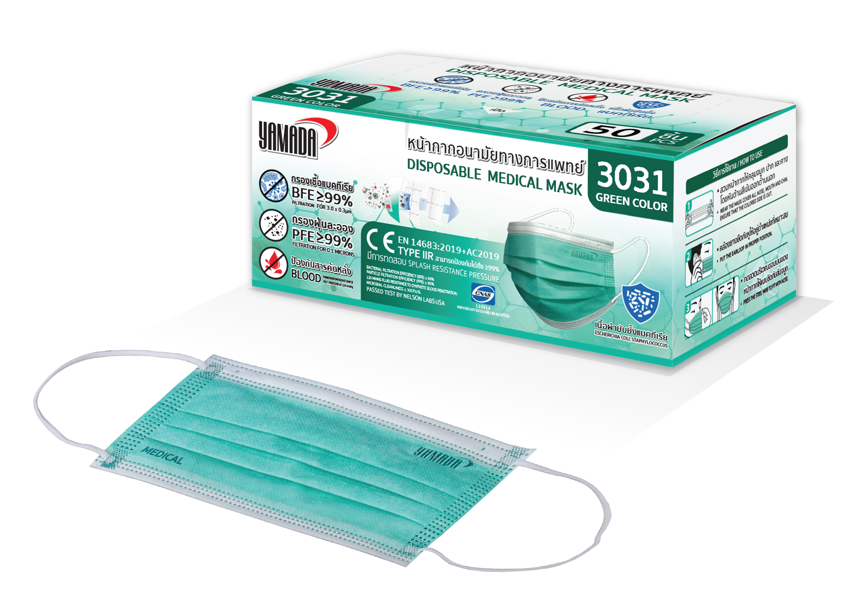 YAMADA 3031 Medical Face Mask, Green, 50 pieces